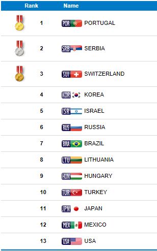 1.º Portugal, 2.º Sérvia, 3.º Suíça, 4.º Coreia, 5.º Israel, 6.º