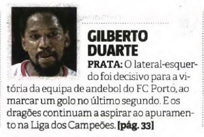 GILBERTO DUARTE: Excelente atleta a todos os níveis excelente e o Andebol português e portista está lhe grato. Mas vai ser pena senão tentar jogar no andebol de TOPO na Europa como estão a fazer seus colegas de equipa, Ferraz, Tiago Rocha, José Costa, Jorge Silva,Filipe, Ricardo Candeias e Treinadores como Paulo Pereira, João Florêncio, Filipe Cruz. Vale a pena correr riscos e ir na aventura que servirá de exemplo para os mais novos.