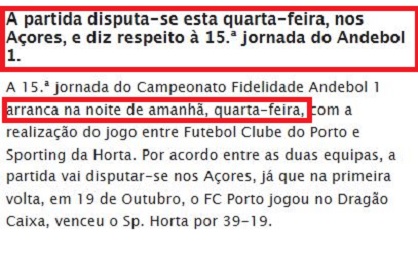 Tanta defesa do pequeno Hugo Santos? Não era melhor dizer a verdade? Hugo teve anteriormente na posição quem? Esse era forte demais mas na verdade aquilo funciona sempre. Sim, aquilo! È que ali dá sempre porque, em momentos de decisão o clube favorecido é sempre o Porto! Já se sabe que este jogador noutro clube não resultava. O que faz falta ao Huguito é umas latas de proteína e ao outro o Franciu Pitre, fumar menos! Quem entende ou jogou já detetou o ponto mais fraco da equipa! O que se passou foi mais uma vergonha em que, devido a viagens e tudo o que implica a presença na champions, o custo chega agora! Claro que, depois são precisos fatores estranhos ao jogo. O Porto tem agora dois jogos importantes, ABC fora e, em casa Sporting! Isto de perder um jogo antes destes, podia ser um caso sério! Há que proteger e receber depois em troca. Como parece que o Horta já está inscrito na segunda, façam srs. federativos o melhor para o andebol.